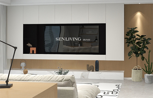 電視柜可以個(gè)性化設(shè)計(jì)制作,底部除了大理石,也可以更換成抽屜,上面是黑白對(duì)比色,回字形電視柜以白色外圍,黑色做內(nèi)嵌,有一定的視覺擴(kuò)容效果??紤]到放置的東西是沒有規(guī)律性的,所以封閉式區(qū)域設(shè)計(jì)的多,并做成了無拉手設(shè)計(jì),更符合客廳觀賞性的需求。中間適當(dāng)留空,可以放軟裝擺件、綠植、書籍、相冊(cè)等,或者不放也是可以的。