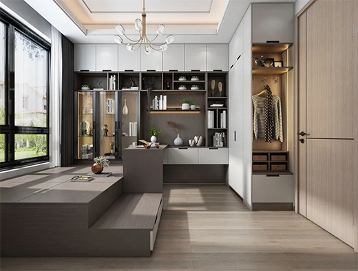 如果房間空間足夠大的話,還可以在這里安裝一個(gè)升降式榻榻米,可以大大提高空間利用率。升降器升起時(shí),榻榻米就是一個(gè)休閑區(qū),可以和好友在這兒聊天、喝茶、打牌,底部空間還可以收納不常用的雜物。升降器降下時(shí),只需在上面鋪一層軟墊或棉絮,再放上被子和枕頭,就代替床來使用,方便親朋好友留宿,實(shí)用性非常強(qiáng)。