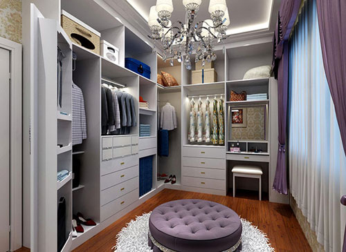衣帽間的設計最大的亮點是:哪里是抽屜,哪里是隔板,哪里放衣服,都會為您安排好,甚至毛巾、襪子、領帶等,也能各就各位,一些入墻柜還設置有帶滑輪的褲架,可以整齊地掛上十幾條褲子,保持通風,不會皺褶,一目了然,而且拿取方便。
