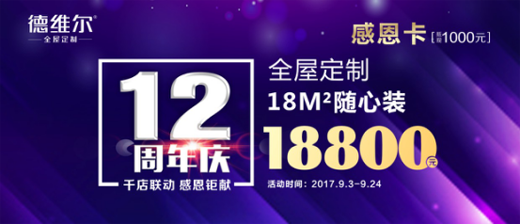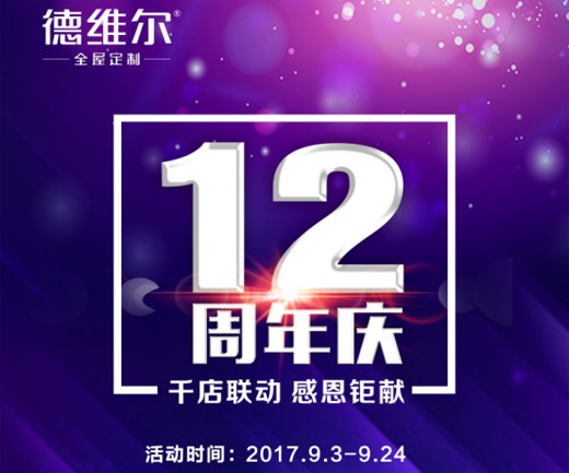 2017年是德維爾成立12周年之際,為了回饋新老客戶對(duì)德維爾全屋定制的喜愛,特意推出12周年盛典活動(dòng),回報(bào)廣大消費(fèi)者對(duì)德維爾的厚愛,活動(dòng)已全面正式上線,這場(chǎng)盛典千萬不要錯(cuò)過!