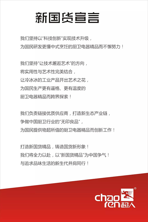 羅子健董事長(zhǎng)表示,超人始終秉承“名牌的質(zhì)量,民牌的價(jià)格,創(chuàng)造有意義的、有溫度的、有靈魂的廚衛(wèi)產(chǎn)品,做中國(guó)的無(wú)印良品”的宗旨,堅(jiān)持以”科技創(chuàng)新"實(shí)現(xiàn)技術(shù)升級(jí),為國(guó)民研發(fā)更懂中式烹飪的廚衛(wèi)電器精品而不懈努力,全力打造新國(guó)貨精品,鑄造國(guó)貨新形象,以“新國(guó)貨精品”為中國(guó)爭(zhēng)氣。