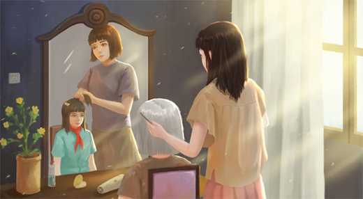 很多人都說,人生就是一個圓,我們從來處來,也從來處去,起點便是終點。所以我時常有種錯覺,老人便是小孩,人的一生是對稱的。此刻,我陪伴著母親,就像對待我的女兒一樣,要充滿愛意,富有耐心,陪伴她成長。