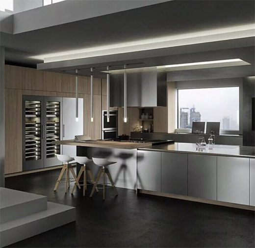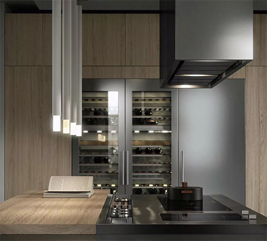 這套作品以木制臺(tái)面和不銹鋼臺(tái)面結(jié)合,構(gòu)成“和諧混搭”,截然不同的氣質(zhì)在碰撞中融合,通過新材質(zhì)和新的比例關(guān)系,全新定義廚房比例關(guān)系的變化,由橫向線條向縱向線條的轉(zhuǎn)變,呼喚出更符合當(dāng)代審美的設(shè)計(jì)。