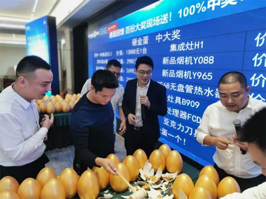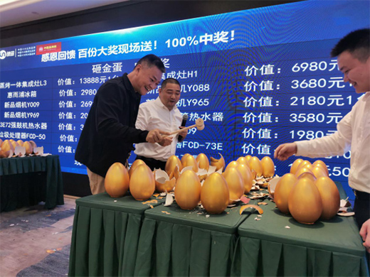 亮點滿滿的優(yōu)惠政策一經(jīng)公布,再次將現(xiàn)場的熱烈氣氛推向新高度。透過經(jīng)銷商發(fā)自內(nèi)心的肯定與滿臉的喜悅之情,我們能看出眾人心中已經(jīng)有了要下單訂貨的強烈欲望,這也正為接下來的下單打款環(huán)節(jié)奠定下基礎(chǔ)。而為感恩各位經(jīng)銷商的下單支持,銀田還特意準(zhǔn)備了砸金蛋環(huán)節(jié),將集成灶、煙機、熱水器等豪華大禮傾情相送。