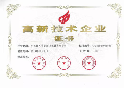 廣東超人節(jié)能廚衛(wèi)電器有限公司在2020年再次被授予“高新技術(shù)企業(yè)”稱號(hào),證書編號(hào)為GR201944001556。從2009年開始,超人已經(jīng)連續(xù)十二年被認(rèn)證為高新技術(shù)企業(yè)。