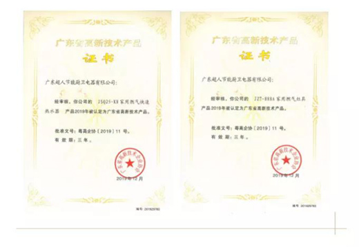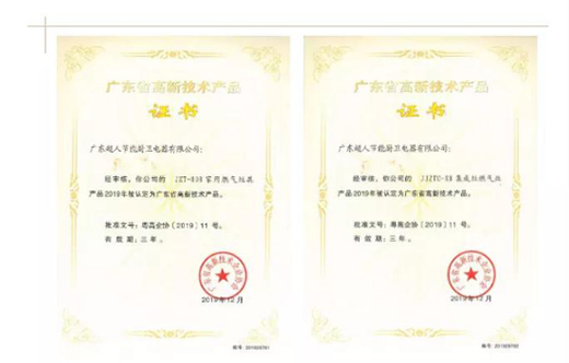 經(jīng)廣東省高新技術(shù)企業(yè)協(xié)會(huì)認(rèn)證專家組的嚴(yán)格審核,廣東超人節(jié)能廚衛(wèi)電器有限公司生產(chǎn)的集成灶燃?xì)庠頙JZTC-X8、家用燃?xì)饪焖贌崴鱆SQ25-XH、家用燃?xì)庠罹逬ZT-808和JZT-888A四款系列產(chǎn)品被認(rèn)定為“廣東省高新技術(shù)產(chǎn)品”。2020年4月14日,四項(xiàng)高新技術(shù)產(chǎn)品證書已經(jīng)正式頒布下發(fā)。