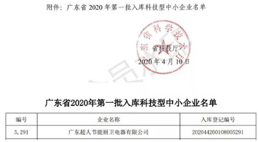根據(jù)《科技型中小企業(yè)評(píng)價(jià)辦法》(國(guó)科發(fā)政[2017]115號(hào))和《科技型中小企業(yè)評(píng)價(jià)工作指引》(國(guó)科火字[2017]144號(hào))要求,2020年4月10日,廣東省科學(xué)技術(shù)廳公布了2020年第一批入庫(kù)科技型中小企業(yè)名單,經(jīng)過公示認(rèn)證,廣東超人節(jié)能廚衛(wèi)電器有限公司入庫(kù)廣東省第一批科技型中小企業(yè),入庫(kù)登記編號(hào)202044200108005291。