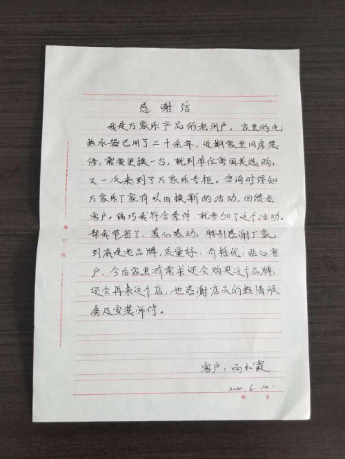 向來(lái)重視服務(wù)的萬(wàn)家樂(lè)的眾多暖心活動(dòng),得到了新老用戶的一致認(rèn)可,眾多享受萬(wàn)家樂(lè)貼心品質(zhì)和服務(wù)的用戶紛紛發(fā)來(lái)感謝信,感謝萬(wàn)家樂(lè)陪伴度過(guò)的這幾十載春秋歲月。而萬(wàn)家樂(lè)也在家電讓家更溫暖的活動(dòng)中獲得了大型社會(huì)公益活動(dòng)示范企業(yè)的稱(chēng)號(hào)。