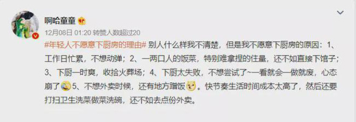最近在網(wǎng)上曾看到過這樣一個話題:#年輕人不愿意下廚的理由#網(wǎng)友們紛紛分享了自己不愿意下廚做飯的原因。