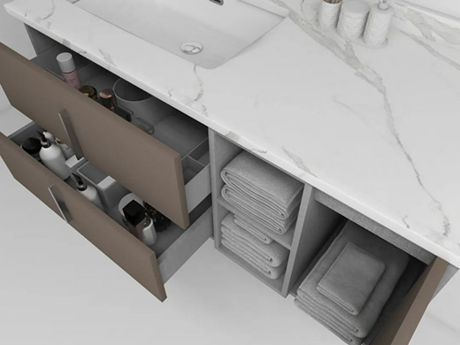 臺面放置常用物品,觸手可及,收放自如;儲物柜放置不常用物品,防潮避塵。分區(qū)收納,讓浴室回歸整潔有序,不僅看起來舒適,也讓洗漱、化妝變得更有效率。