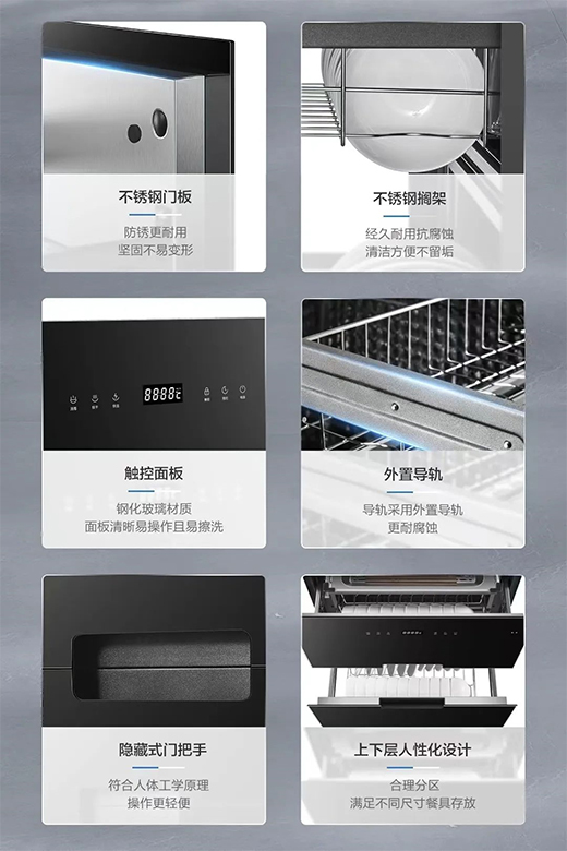除了上述優(yōu)質(zhì)的存儲、消毒性能之外,老板消毒柜XB710A還擁有多重體貼入微的人性化設(shè)計:安全童鎖功能,防止中途誤觸以及寶寶好奇誤觸;觸控面板,易操作易擦洗,便捷省心;隱藏式把手符合人體工學(xué)設(shè)計;不銹鋼擱架、不銹鋼門板經(jīng)久耐用······