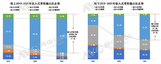 奧維云網(wǎng)數(shù)據(jù)顯示,2021年嵌入式復合機整體規(guī)模95萬臺、56億元,零售量同比增長22%,零售額同比增長26%。同比2019年零售量增長98%,零售額同比增長104%。其中,嵌入式蒸烤占比逐年提升,2021年已超75%。