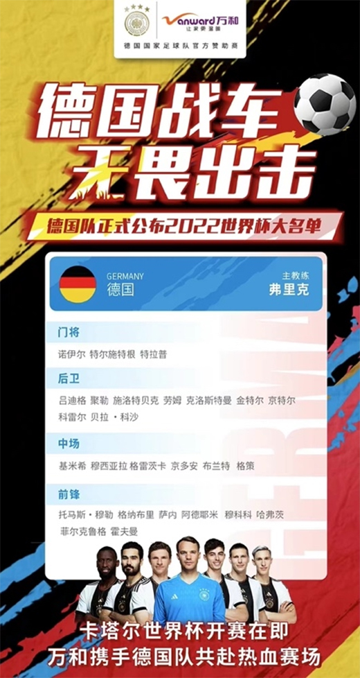 今年世界杯依舊看點(diǎn)十足,各路傳統(tǒng)強(qiáng)隊(duì)攜強(qiáng)力陣容向大力神杯發(fā)起沖擊,眾多老將即將在卡塔爾綠茵場進(jìn)行“最后一舞”,只為不留遺憾。本屆世界杯德國隊(duì)也將卷土重來,拋除上屆世界杯失利的陰霾,德意志戰(zhàn)車將吹響賽場雪恥的號(hào)角,展現(xiàn)頑強(qiáng)與嚴(yán)謹(jǐn)?shù)木?。在今年,同樣以秉持著?yán)謹(jǐn)品牌態(tài)度的廚衛(wèi)電器專家萬和也已重磅官宣與德國足協(xié)達(dá)成簽約合作,成為德國國家足球隊(duì)的中國區(qū)官方合作伙伴。雙方將秉承嚴(yán)謹(jǐn)?shù)膶I(yè)理念和友好的合作態(tài)度,共赴卡塔爾賽場,再造傳奇。