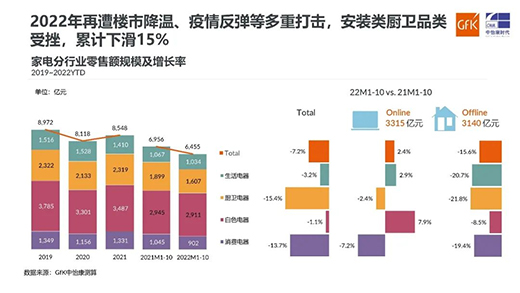 2022年對(duì)于家電市場(chǎng)又是一場(chǎng)攻堅(jiān)戰(zhàn),在疫情反復(fù)、房地產(chǎn)震蕩、消費(fèi)者心態(tài)趨于保守、整體市場(chǎng)不振等諸多內(nèi)外因素夾擊下,2021年的大反彈未能延續(xù)。根據(jù)GfK中怡康測(cè)算,2021年,中國(guó)家電市場(chǎng)零售額同比增長(zhǎng)了5.3%,但2022年1~10月,零售額規(guī)模已同比下滑7.2%。其中廚衛(wèi)電器尤為突出,零售額同比下滑15.4%,行業(yè)高地遭遇大挑戰(zhàn),且雙線都呈現(xiàn)負(fù)增長(zhǎng),線下跌幅高達(dá)21.8%。