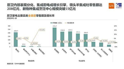 廚衛(wèi)電器遭遇挑戰(zhàn),內(nèi)部品類分化明顯。發(fā)展時(shí)間較長(zhǎng)、較為成熟的油煙機(jī)、燃?xì)庠?、熱水器等專業(yè)廚電產(chǎn)品出現(xiàn)了零售額大幅同比下滑。2022年1~10月,油煙機(jī)零售額同比下滑14.2%,燃?xì)庠钕禄?1.0%,燃?xì)鉄崴飨禄?6.9%,降幅基本都大于行業(yè)平均水平。作為行業(yè)發(fā)展新引擎的集成廚電則在不斷發(fā)展壯大,從目前數(shù)據(jù)看,包括集成灶、集成烹飪中心、水槽洗碗機(jī)、集成洗碗機(jī)等品類在內(nèi),集成廚電規(guī)模已經(jīng)達(dá)到237億元,在廚衛(wèi)電器內(nèi)部占比達(dá)到了15%。其中,集成洗碗機(jī)零售額同比漲幅達(dá)到41.6%,表現(xiàn)優(yōu)異;集成灶零售額保持穩(wěn)定,規(guī)模達(dá)209億元,位列廚衛(wèi)電器行業(yè)第四位,相信隨著后期疫情的解封和管控政策變化,壓抑的需求會(huì)再次釋放,品類將迎來(lái)利好。