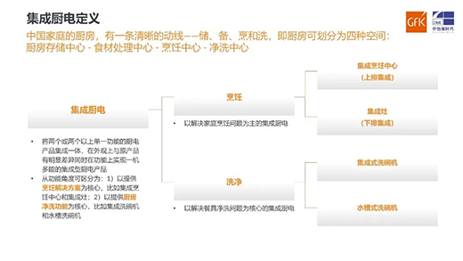 關(guān)于集成廚電,GfK中怡康認(rèn)為是將兩個(gè)或兩個(gè)以上單一功能的廚電產(chǎn)品集成一體、在外觀上與原產(chǎn)品有明顯差異、同時(shí)在功能上實(shí)現(xiàn)一機(jī)多能的集成型廚電產(chǎn)品?,F(xiàn)階段集成廚電可劃分為兩大類:以解決家庭烹飪問(wèn)題為主的烹飪類集成廚電,和以解決廚房餐具清洗問(wèn)題為核心的洗凈類集成廚電。前者主要包含了以上排集成為特性的集成烹飪中心和以下排集成為特性的集成灶,后者主要以集成式洗碗機(jī)和水槽式洗碗機(jī)為代表。