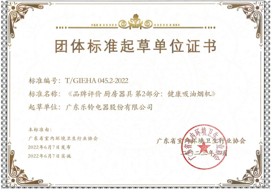 2023年,樂鈴憑借著在廚房電器領(lǐng)域內(nèi)吸油煙機(jī)和集成灶對(duì)廚房油煙難關(guān)的攻克,參與《健康吸油煙機(jī)》、《健康集成灶》等團(tuán)體標(biāo)準(zhǔn)的制定,推動(dòng)行業(yè)的健康升級(jí),守護(hù)億萬家庭的呼吸健康。