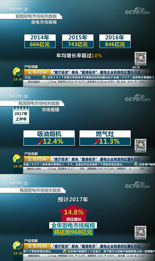 采訪中提到,在家電行業(yè)中,相比白電、黑電企業(yè),廚電企業(yè)利潤是最高的,隨著人們生活水平的提高,廚電在消費(fèi)者眼中地位也越來越高,“廚房經(jīng)濟(jì)”逐步代替“客廳經(jīng)濟(jì)”,使家庭廚房逐漸成為家庭活動(dòng)中心,價(jià)格也在不斷的提升。中怡康數(shù)據(jù)顯示,2014年~2016年廚電市場規(guī)模分別達(dá)到666、743、846億元,年均增產(chǎn)率超過10%,以吸油煙機(jī)及燃?xì)庠顬榇淼膫鹘y(tǒng)廚電品類,在2017上半年,依然保持兩位數(shù)增長,分別為12.4%以及11.3%,高于整體家電市場增長速度,預(yù)計(jì)2017年全年廚電市場規(guī)模將達(dá)到978億元,同比增長14.8%。