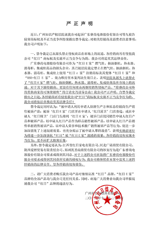 廣東睿尚電器股份有限公司作為“紅日 E 家”燃?xì)庠?、抽油煙機(jī)、熱水器、消毒柜、集成灶商品的源頭企業(yè),其已被法院裁定禁止在燃?xì)庠?、抽油煙機(jī)、熱水器、消毒柜、集成灶上使用“紅日 e 家”注冊(cè)商標(biāo)及其變體“紅日 E 家”和“RSE+紅日 E 家”,效力維持至本案判決生效日止。表明法院從源頭上就禁止了“紅日 E 家”燃?xì)庠?、抽油煙機(jī)、熱水器、消毒柜、集成灶商品在市場上的流通,對(duì)于其下游經(jīng)銷商,更沒有任何理由再繼續(xù)銷售侵權(quán)產(chǎn)品?!俺I泄就獾钠渌碳揖衫^續(xù)銷售”的言論實(shí)乃誤導(dǎo)公眾!我公司嚴(yán)正聲明,自禁令裁定做出之日起,各經(jīng)銷商再有侵犯我公司“紅日”商標(biāo)權(quán)及實(shí)施不正當(dāng)競爭行為的,我公司將依法單獨(dú)追究其法律責(zé)任!
