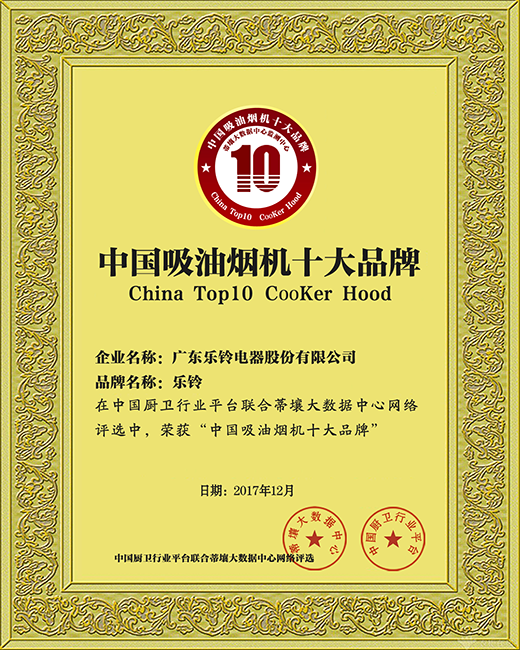 實(shí)至名歸!樂鈴廚電榮膺2017年度十大吸油煙機(jī)品牌!