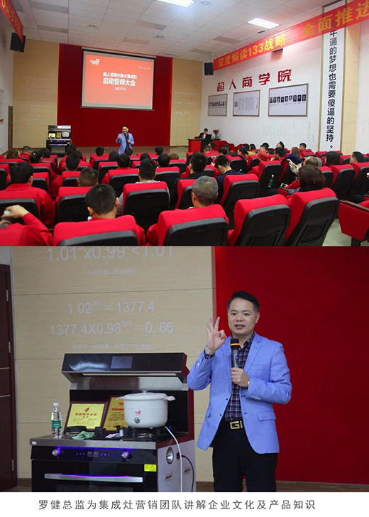 在啟動誓師大會上,超人安防集成灶項目負(fù)責(zé)人總結(jié)了集成灶2017年的運營狀況,分析了2018年集成灶市場,并詳細(xì)講解了超人安防內(nèi)旋火集成灶2018年的規(guī)劃。
