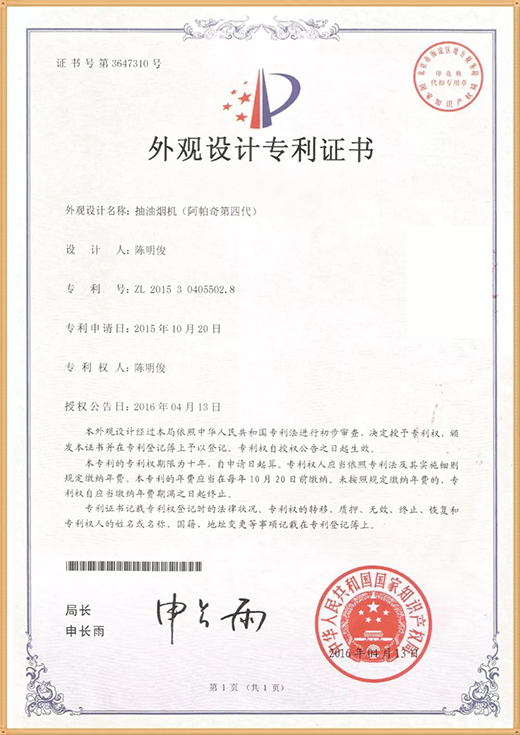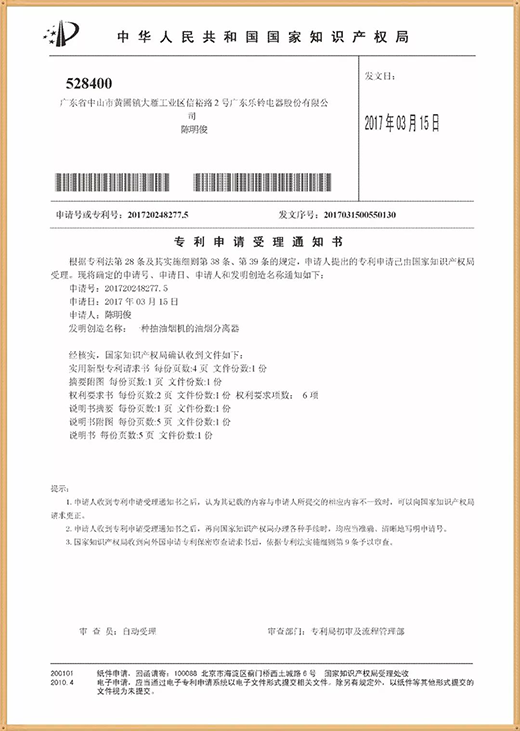 不同于行業(yè)其他品牌,樂(lè)鈴廚電N9煙機(jī)榮獲國(guó)家外觀設(shè)計(jì)專(zhuān)利(專(zhuān)利號(hào):ZL 201530405502.8),造型時(shí)尚化、個(gè)性化凸顯。