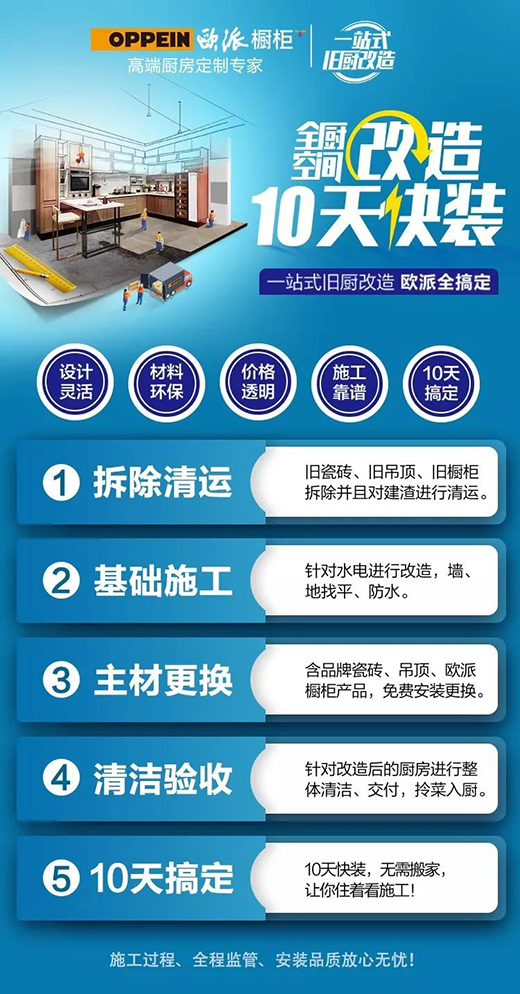 深耕櫥柜定制領(lǐng)域的歐派,為解決用戶痛點(diǎn),針對不同消費(fèi)者改造需求推出2種舊廚改造服務(wù)模式:“全廚空間改造10天快裝服務(wù)”和“舊櫥換新48小時閃裝服務(wù)”。同時在廚舊迎新之際,歐派櫥柜還推出了“舊廚多少天,就免多少錢”,憑房產(chǎn)證房齡享優(yōu)惠的惠民大行動,大力推廣舊廚改造活動,力求讓更多消費(fèi)者享受到高品質(zhì)的廚房生活。