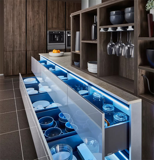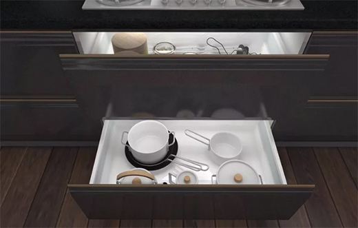 將地柜設(shè)計成兩層拉籃,將廚房內(nèi)最經(jīng)常用到的碗碟放在上層拉籃,將不經(jīng)常用到的鍋具放在下層拉籃,垂直化收納。