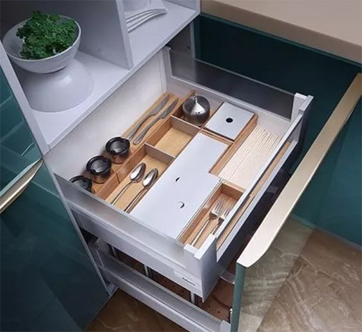 櫥柜抽屜利用收納格做好分區(qū)管理,不同物品分門別類擺放整齊。物品取用一目了然,再也不愁找不到東西啦。