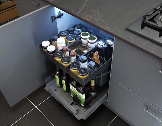 利用多功能拉籃也可以將不規(guī)則化為整潔,像家里調(diào)味品,利用多功能拉籃將調(diào)味料等零碎的物品放入,相比放在臺面上干凈整潔,瓶子也不容易推倒打碎。