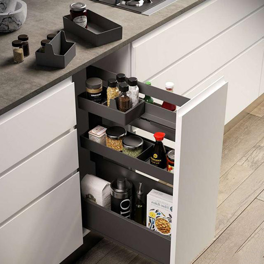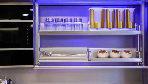 為了符合人體工程學(xué),實現(xiàn)以人為本,不僅吊柜的尺寸設(shè)計有要求,另外吊柜的門把手也要符合使用者身高。為更好的使用吊柜上部儲物,Pablo不銹鋼櫥柜還采用手動吊柜升降拉籃、感應(yīng)智能升降拉籃,讓上部儲物觸手可及,廚房操作省心省力。
