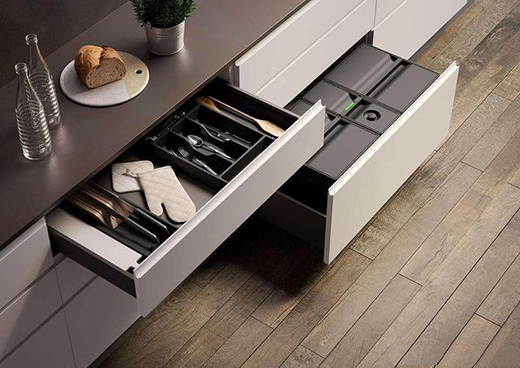 在不銹鋼櫥柜的收納空間,除了設(shè)置玻璃或者不銹鋼襯板,抽屜也是櫥柜中極為重要的組成部分。抽屜有著襯板沒有的優(yōu)點:存放整齊有序,一目了然,使用十分方便。帕布勒選用凱斯寶瑪、抽屜式收納,等著名品牌的碗碟拉籃、調(diào)味籃,將廚房中的碗碟、刀叉餐具和調(diào)味品分門別類擺放,十分整齊,大大提高廚房效率。