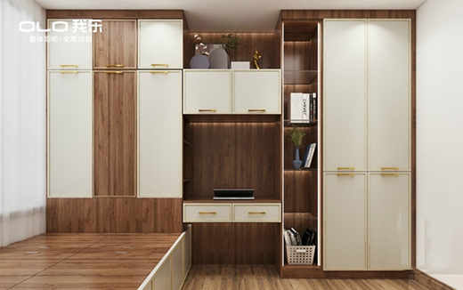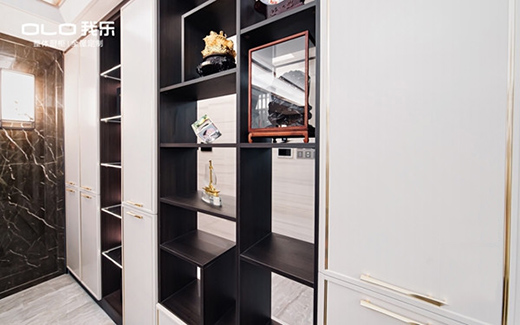 中段博古架設(shè)計(jì)保證了空間的通透性,也可以用來(lái)放置一些隨手物品或裝飾物,具有展示作用。封閉式柜體兼具大量?jī)?chǔ)物空間,衣物鞋子都可以妥善收納。