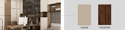 除了入戶區(qū),其他空間均使用「柏悅」系列,深棕胡桃和混油奶咖的配色讓空間更加柔和明亮。