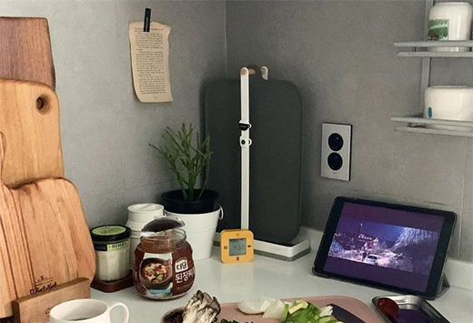 以前的廚房小又凌亂,現(xiàn)在,還可安放一臺(tái)ipad,讓媽媽在備菜勞累時(shí)可放松下,臺(tái)面上的物品也有條不紊地放著,有一套好廚柜果然很重要。