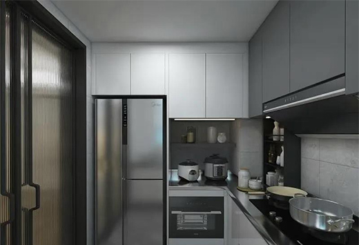 U字型的設(shè)計(jì),超強(qiáng)儲(chǔ)物能力的廚柜定制來節(jié)省空間,其美觀時(shí)尚、經(jīng)濟(jì)適用的定位滿足現(xiàn)代都是人的需求。深灰色的櫥柜面板搭配淺色幾何圖案,調(diào)配出完美的居家環(huán)境。