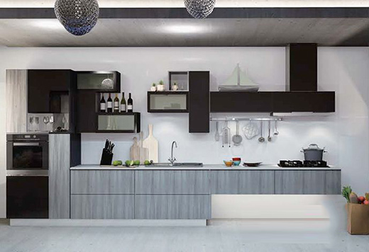 色彩簡(jiǎn)單、搭配合理、各功能區(qū)分工明確,黑色、米白色和石灰色的特殊搭配是的櫥柜看起來(lái)更加的高貴脫俗,黑色鋁框玻璃吊柜的設(shè)計(jì)帶著一抹獨(dú)特,是這套櫥柜的點(diǎn)睛之筆。