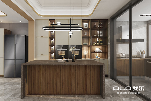 我樂整體櫥柜的“容悅”系列,也同樣能讓廚房溫暖加倍。該系列由鳶尾雅灰與黛木棕兩款花色組成,描金線條的加入提亮了空間。而在搭配中,我樂的設(shè)計師們常常加入茶色玻璃元素,這不僅能讓精致的餐盤器具成為廚房空間展陳的一部分,也讓廚房空間更有人情味和煙火氣,暖意濃濃。