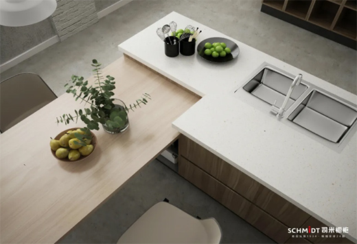司米的石英石臺(tái)面,石英石含量達(dá)93%,硬度達(dá)到莫氏硬度6.5以上,用刀等尖銳物品磕碰,不怕劃傷;而且石英石材質(zhì)更耐酸堿、耐腐蝕、耐高溫、耐油污,幾乎不需要任何保養(yǎng),易打理。
