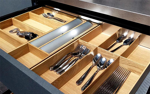 在規(guī)劃廚房空間時(shí),預(yù)算充足的話可以考慮多做抽屜,多層寬面幅、大縱深抽屜設(shè)計(jì),加上內(nèi)部設(shè)有的可移動(dòng)隔板,靈活性和分類性強(qiáng),為餐具等儲(chǔ)物提供了更細(xì)分的空間,搭配的阻尼緩沖滑軌,增強(qiáng)了使用的好感度,輕柔關(guān)閉有效保護(hù)柜身。