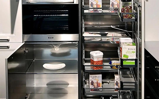 在物品收納里,柜內(nèi)加裝拉籃不失為一種好的方式,不同的尺寸,不同的功能分區(qū)都可以將物品擺放的整整齊齊??ɡ麃啿讳P鋼廚柜有窄拉籃,用于狹長(zhǎng)空間的調(diào)味等瓶瓶罐罐擺放;寬拉籃,用于碗碟等餐具的擺放;轉(zhuǎn)角拉籃,主要用于轉(zhuǎn)角空間深度較深拿取不方便等使用,均可相應(yīng)配套在下柜內(nèi),高柜里可使用的高深拉籃容量足夠大,憑一己之力即可將瑣碎的物件“攬入心懷”。