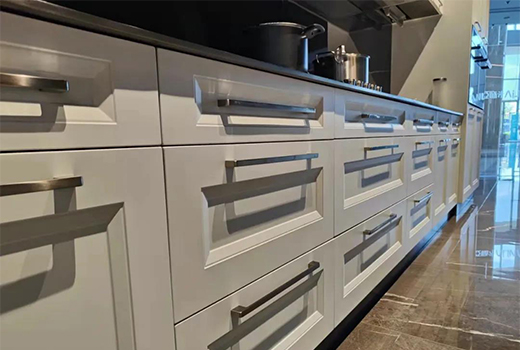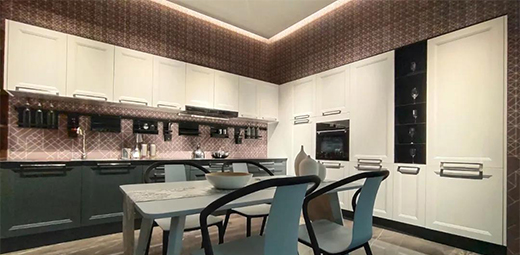 在設(shè)計(jì)上,維羅妮卡系列采用美式風(fēng)情的線條勾勒了廚柜的門板結(jié)構(gòu),以壓紋的造型凸顯了廚柜的視覺層次,以便于抓握的金屬加長拉手與之相得益彰,將轉(zhuǎn)角一隅的落地高柜造型嵌入韻味無窮的墻面系統(tǒng),節(jié)省空間的同時(shí)也別有一番風(fēng)味。不同模塊的組合形成了功能各異的搭配,細(xì)節(jié)設(shè)計(jì)豐富了空間的效果,也滿足了廚房的收納所需,讓人不禁感嘆即使廚房不大也可包羅萬象。