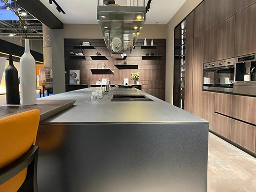 在設(shè)計(jì)上,梅里雪山系列采用中島懸浮式吊架收納煙機(jī)。不銹鋼灶臺(tái)、水槽、收納槽等集成式臺(tái)面銜接煙熏色木紋餐桌,創(chuàng)造出整體設(shè)計(jì)的不同視覺效果。內(nèi)嵌一體式把手設(shè)計(jì),可輕松開啟柜門。兩側(cè)的玻璃柜門,將收納物品高度可視化,不同材質(zhì)的搭配讓整片高柜呈現(xiàn)更有層次感,大廚房的輕奢質(zhì)感展露無遺。
