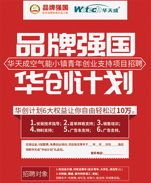 七月,華天成還啟動了青年創(chuàng)業(yè)扶持計劃啟動,針對河北區(qū)域的有志青年推出品牌強國華創(chuàng)計劃。華天成免費進行創(chuàng)業(yè)培訓,安裝技術指導,首單樣板支持,銷售培訓,物料支持,廣告車支持,為大家掃平創(chuàng)業(yè)路上的障礙。
