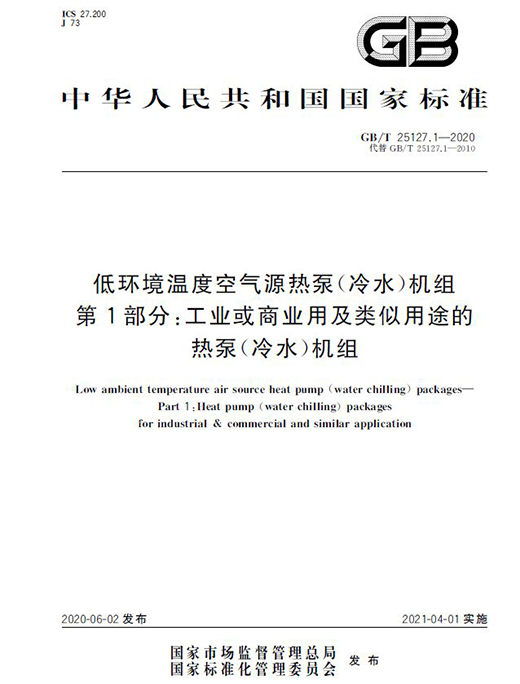 國家市場監(jiān)督管理總局和國家標(biāo)準(zhǔn)化管理委員會于2020年6月2日發(fā)布最新低溫空氣源熱泵(冷水)機(jī)組標(biāo)準(zhǔn)GB/T25127.1~.2-2020《低環(huán)境溫度空氣源熱泵(冷水)機(jī)組》代替GB/T25127.1~.2-2010《低環(huán)境溫度空氣源熱泵(冷水)機(jī)組》,新標(biāo)準(zhǔn)的實施時間為2021年4月1日,最新標(biāo)準(zhǔn)針對機(jī)組區(qū)分范圍、機(jī)組型式、低溫運行的溫度、試驗工況及允差等方面進(jìn)行了更加嚴(yán)格的調(diào)整。