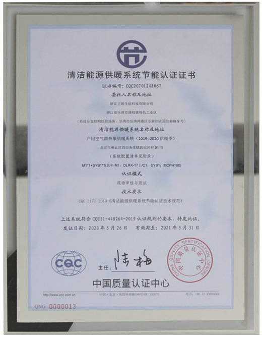 同時,生能憑借產品高效節(jié)能的優(yōu)勢,獲得CQC中國質量認證中心頒發(fā)的“清潔能源供暖系統(tǒng)節(jié)能認證”。這也標志著生能獲得國家權威機構的認可。