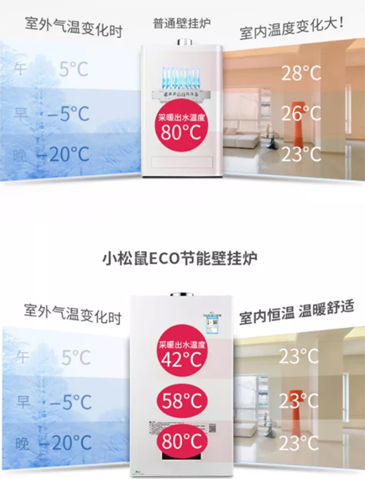 常規(guī)壁掛爐在天氣變化下無(wú)法及時(shí)自動(dòng)調(diào)節(jié)水溫,造成供暖不足和燃?xì)饫速M(fèi)。比如,普通壁掛爐采暖出水溫度恒定,室外氣溫變化時(shí),室內(nèi)溫度變化大,不僅室內(nèi)溫度達(dá)不到舒適的要求,還白白浪費(fèi)了燃?xì)夂碗娰M(fèi)。而小松鼠B20壁掛爐采用二代ECO節(jié)能技術(shù),當(dāng)室外氣溫變化時(shí),出水溫度會(huì)隨著氣溫變化而變化,實(shí)現(xiàn)自動(dòng)調(diào)整采暖及出水水溫,保持室內(nèi)溫度恒定,不僅居家溫暖舒適,耗氣量也會(huì)大大降低。