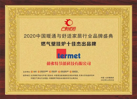 十二月五日,在來自全國暖通行業(yè)的各品牌方、代理商、經(jīng)銷商、工程商及各大媒體的的共同見證下,TERMET特梅特在于北京雁棲湖舉行的年度中國暖通與舒適家居產(chǎn)業(yè)大會暨慧聰暖通行業(yè)品牌盛會上榮獲“2020年度燃氣壁掛爐十佳杰出品牌”稱號。