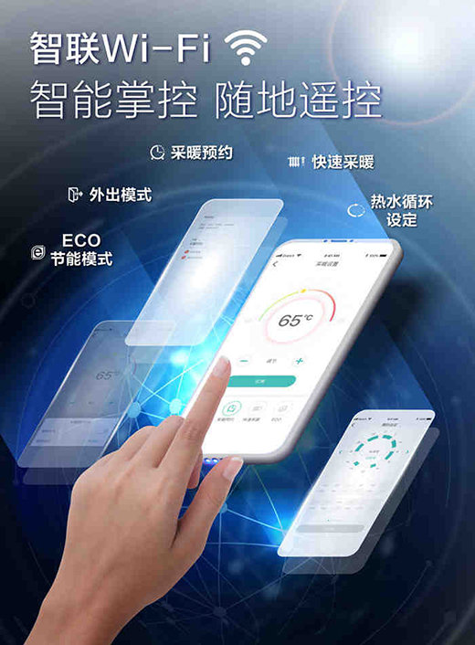 林內睿擎系列搭載WIFI遠程智控,即使不在家中,也能手機遠程開啟采暖模式,輕松調節(jié)室內采暖溫度及預設水溫。