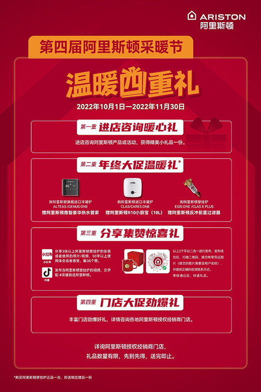 阿里斯頓是一個(gè)有溫度的品牌,始終致力于為人們營造一直有溫度的家,已經(jīng)連續(xù)四年舉辦采暖節(jié),為新老用戶在采暖季送上暖心優(yōu)惠及精美禮品。2022年10月1日~11月30日,第四屆阿里斯頓采暖節(jié)火熱進(jìn)行中,特推出“溫暖四重禮”,進(jìn)店咨詢、下單購買、分享集贊等滿足條件的將有豪禮相送!